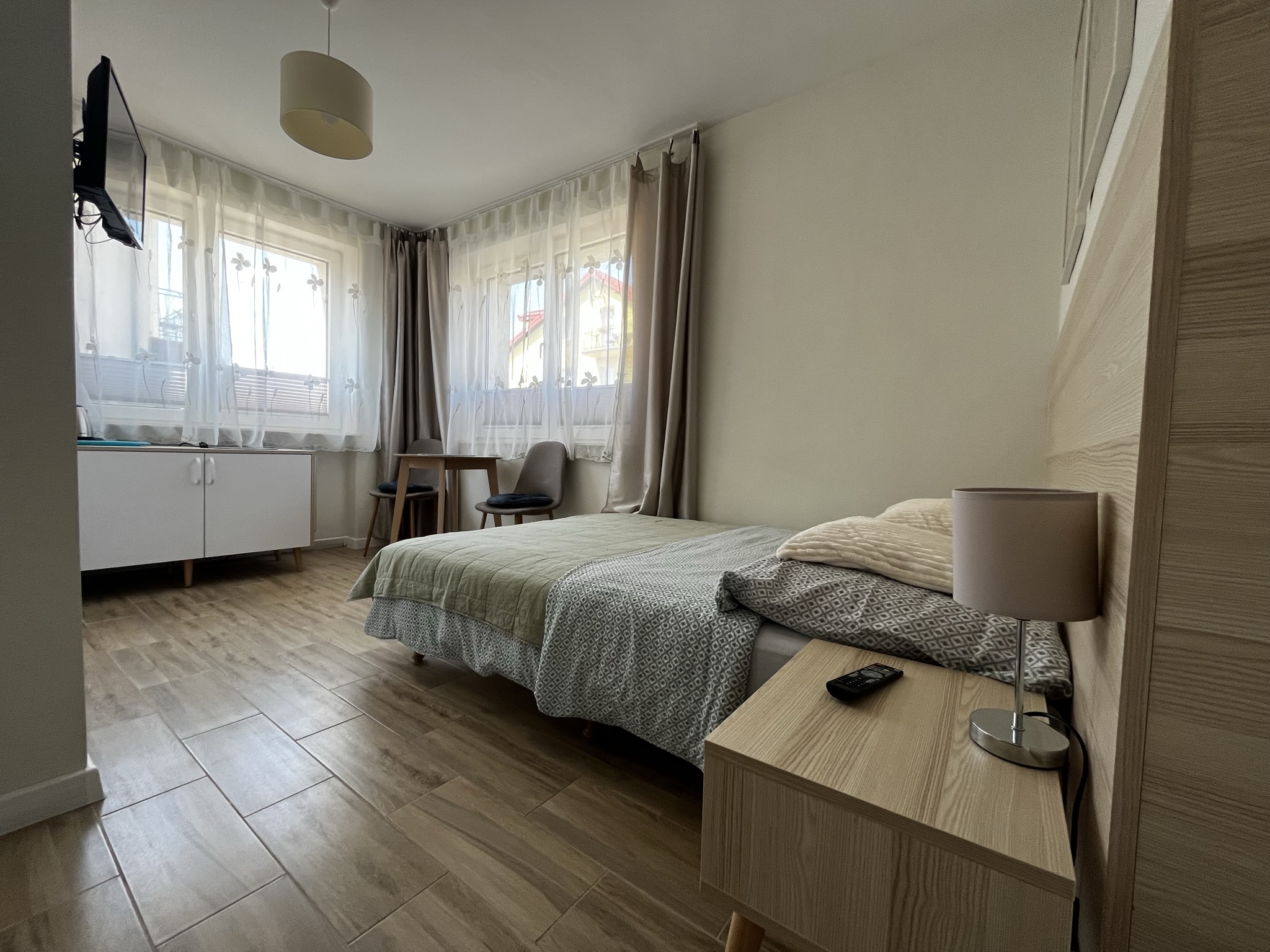 Pokój znajduje się na parterze, piętro wyżej znajduje się aneks kuchenny. Łazienka w pokoju.